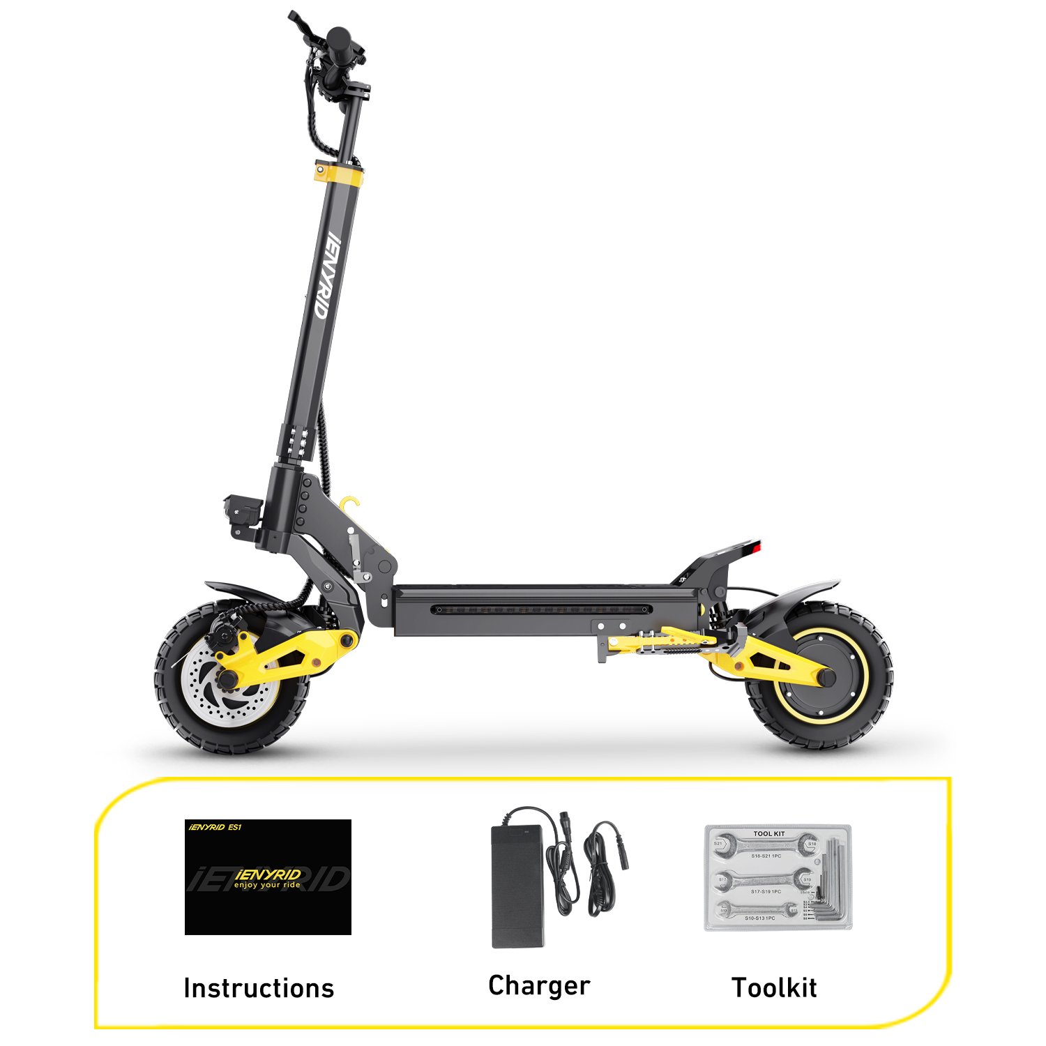 To handle its high speeds, the ES1 features a premium hydraulic spring suspension system on both the front and rear wheels. This setup, combined with 10-inch pneumatic off-road tires, creates a floating sensation over bumps and rough terrain. For safety, the electronic disc brakes provide instant and responsive stopping power.