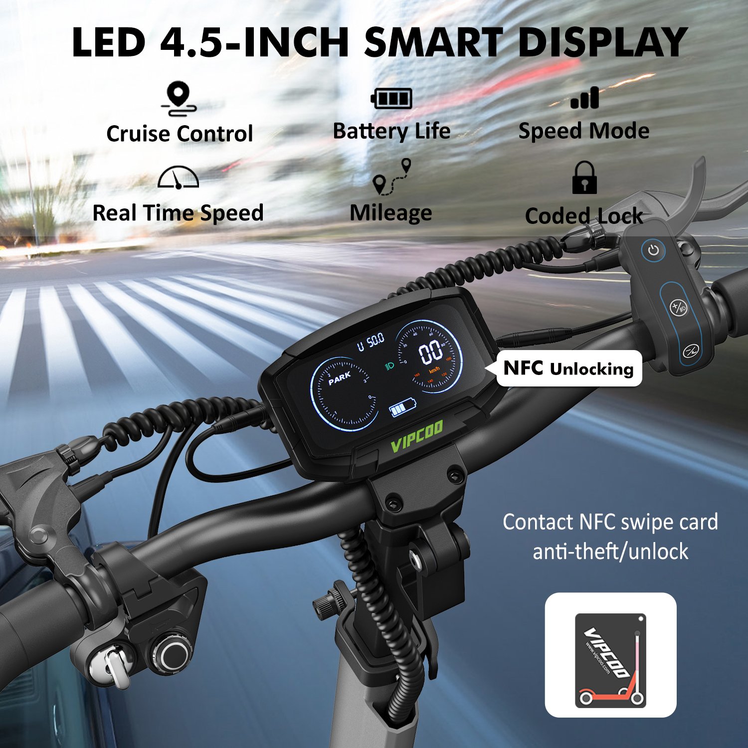 Urban Style Meets Off-Road Power. The Vipcoo VS6 stands out with its fantastic motorcycle-inspired design and advanced security features. Powered by a 1000W motor and protected by an NFC Card Lock, it offers a perfect blend of performance, safety, and unique aesthetics for the modern commuter.